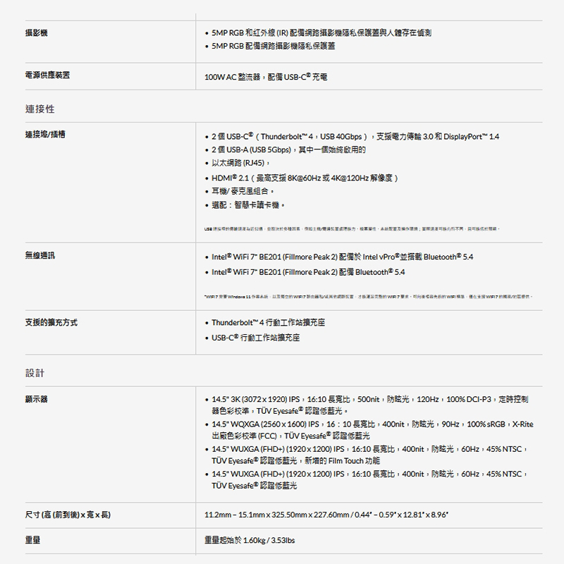 - 14.5″ WUXGA (1920 x 1200)、IPS、防眩光、非觸控、45%NTSC、400 nit、60 Hz