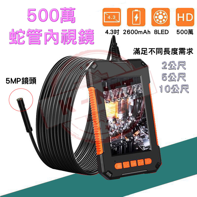 2米 5米 10米 8mm微型鏡頭 工業級 高畫質 5MP 蛇管攝影機 內視鏡 4.3吋 大螢幕 防水鏡頭 汽車/空調/管道間