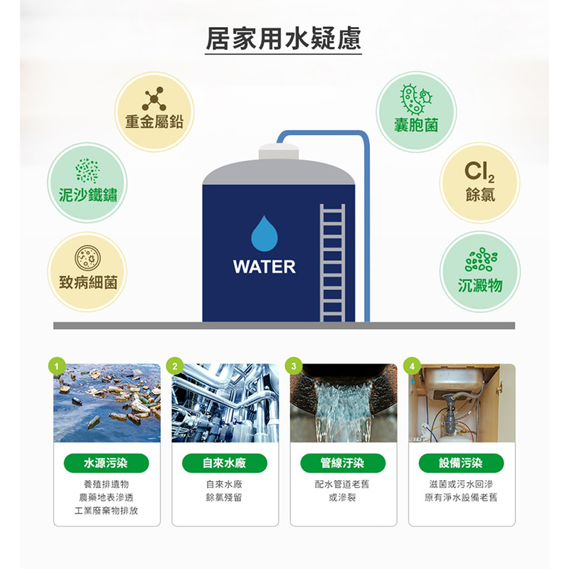 ◆選用通過美國NSF認證(42.53)的高密度活性碳棒濾心,有效濾除餘氯及異味、沈積物、孢囊菌、重金屬鉛。