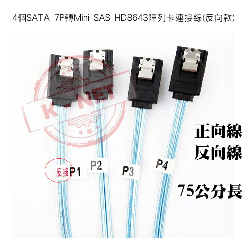 1.反向線:用於主機板上或PCIe轉SATA擴充卡上的SATA資料介面連接至硬碟槽背板上的MINI SAS HD SFF8643介面。