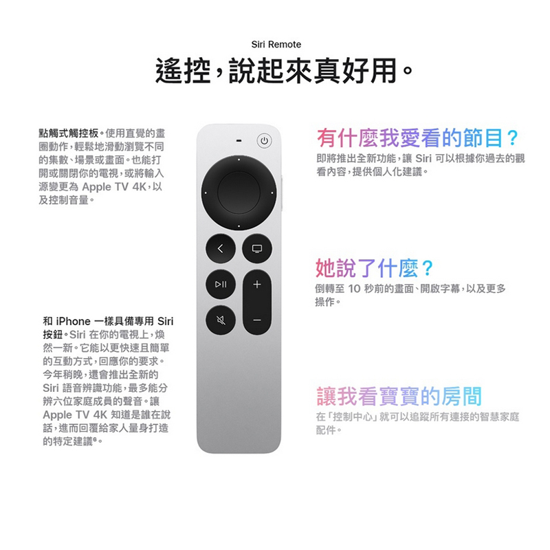 • SiriRemote具備點觸式觸控板,可精準掌控