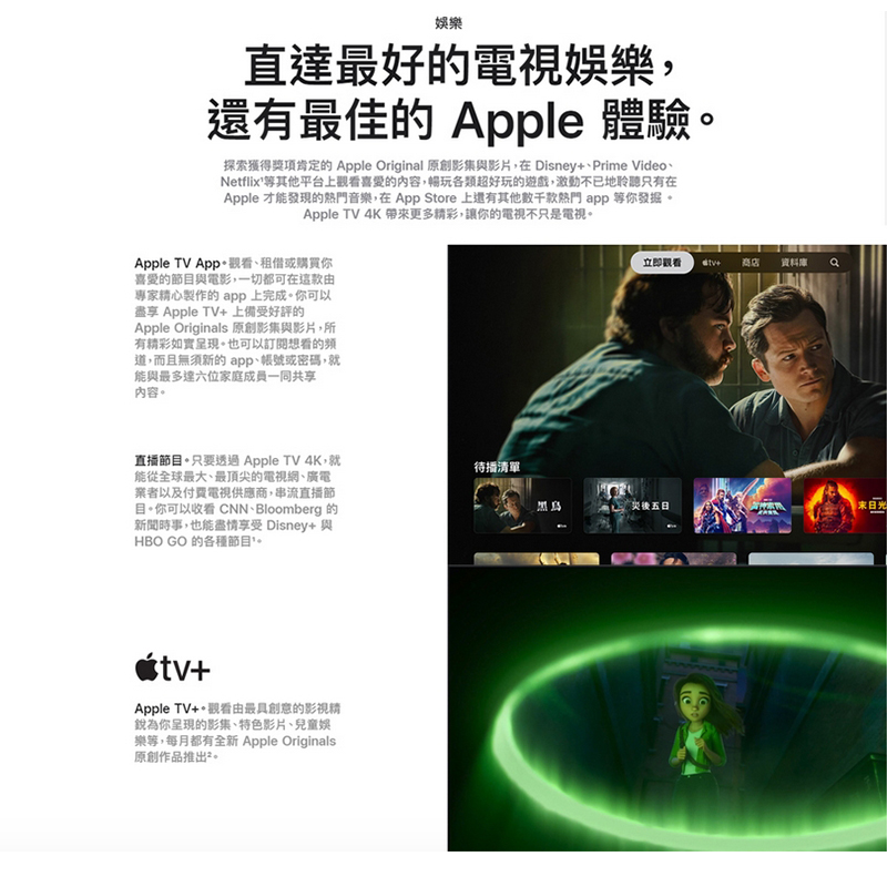 (1)可能須訂閱以存取部分內容。並非所有內容皆以 4K HDR 格式提供。4K 解析度須使用可播放 4K 畫質的電視。項目及 app 的供應狀況會有所變動。部分 app 並未在所有地區提供。
