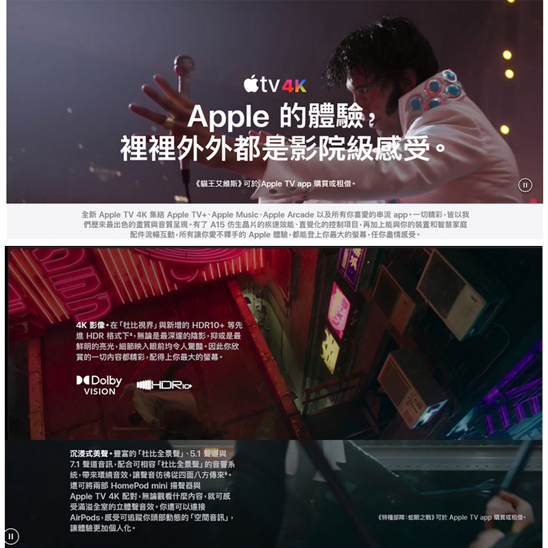 (2)「杜比全景聲」功能須搭配支援「杜比全景聲」的裝置,可能未適用於所有內容及語言。