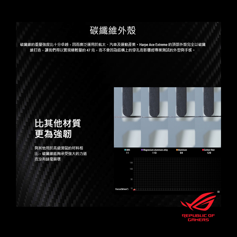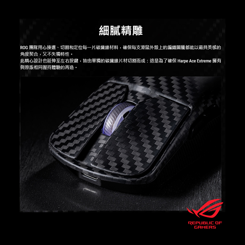 - 碳纖維結構:滑鼠外殼採用碳纖維材質,並以精密的製造工程製成
