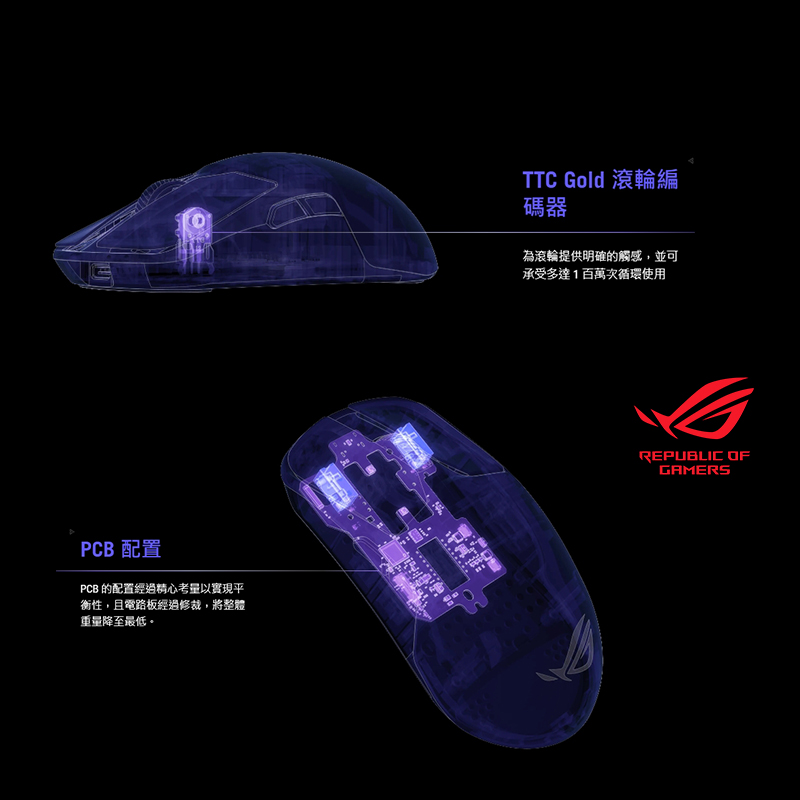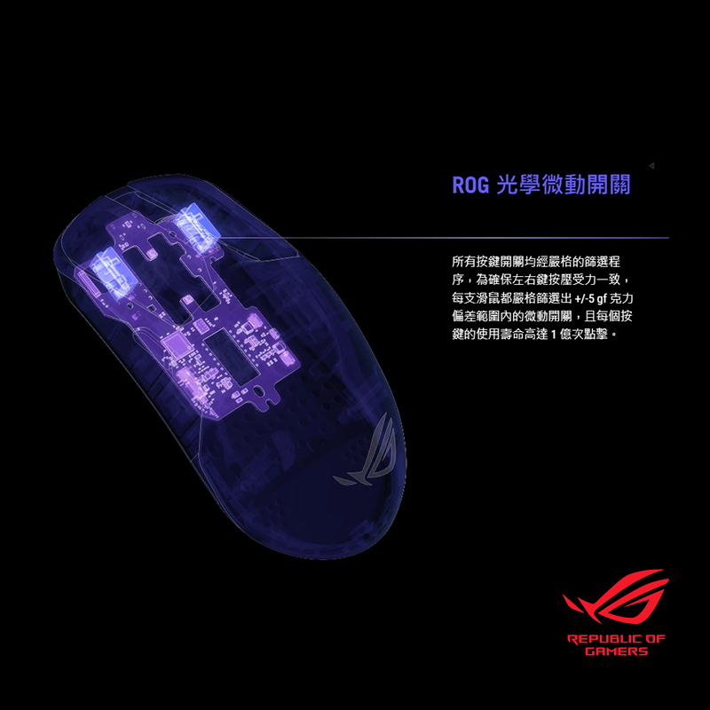 - ROG 光學微動開關:觸發俐落即時,擁有 1 億次點擊使用壽命
