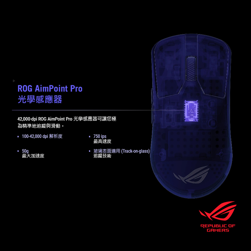 - ROG AimPoint Pro 光學感測器:42,000 dpi 光學感測器,具有極為精確的 <1% 偏差與玻璃追蹤技術