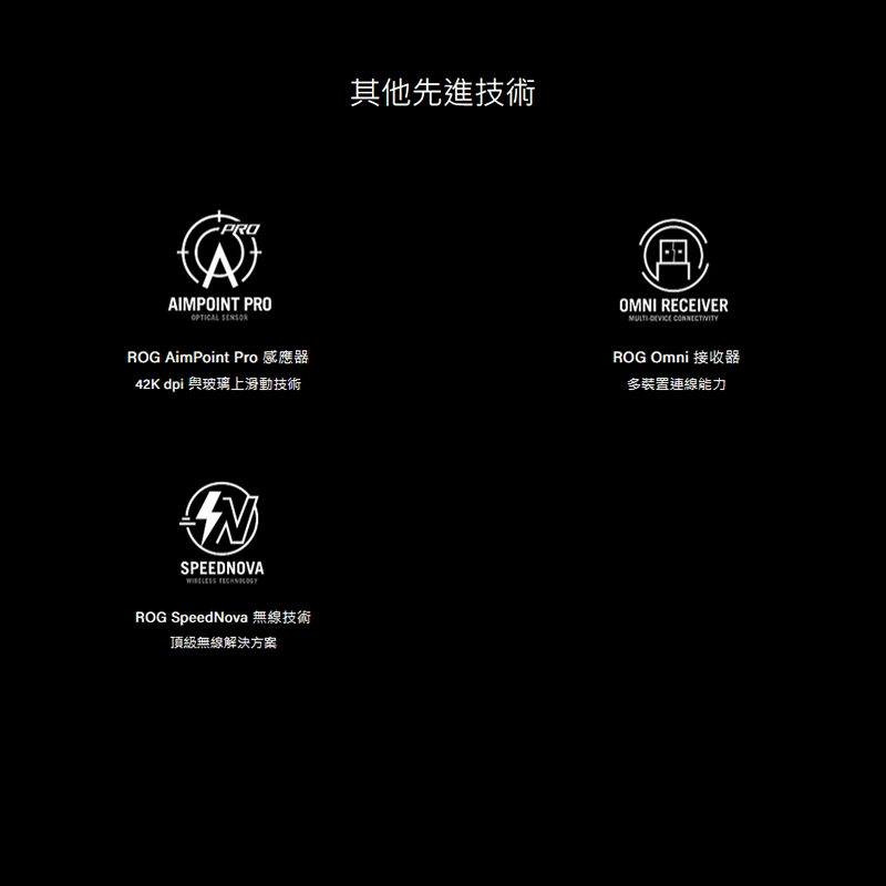 • ROG AimPoint Pro 光學感應器:42,000 dpi 的光學感應器,提供極致精準度,並支援玻璃上滑動技術
