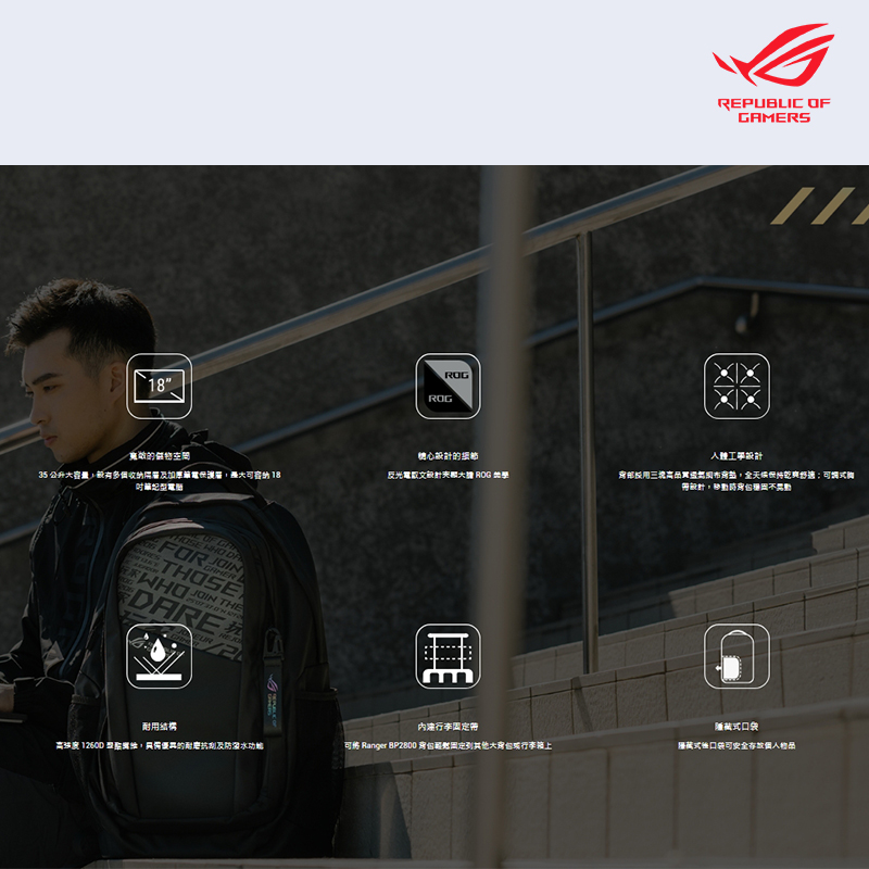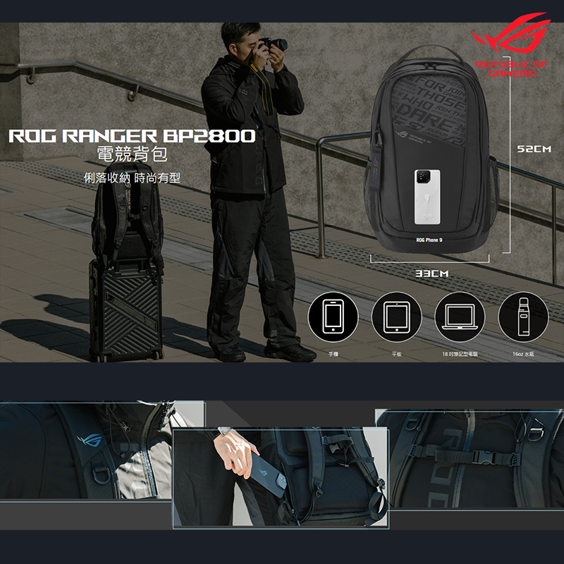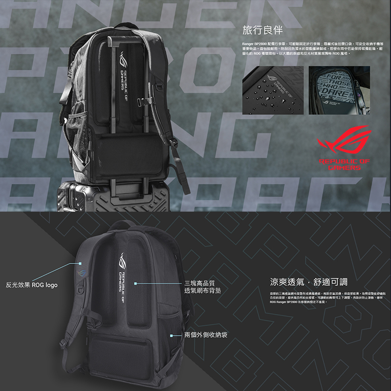 Ranger BP2800 配備行李帶,可輕鬆固定於行李箱;隱藏式後拉鍊口袋,可安全收納手機等重要物品。背包採耐用、防刮且防潑水的聚酯纖維製成,即使在雨中也能保持裝備乾燥。輕量化的 ROG 電競背包,以大膽的斜線和反光材質展現獨特 ROG 風格。