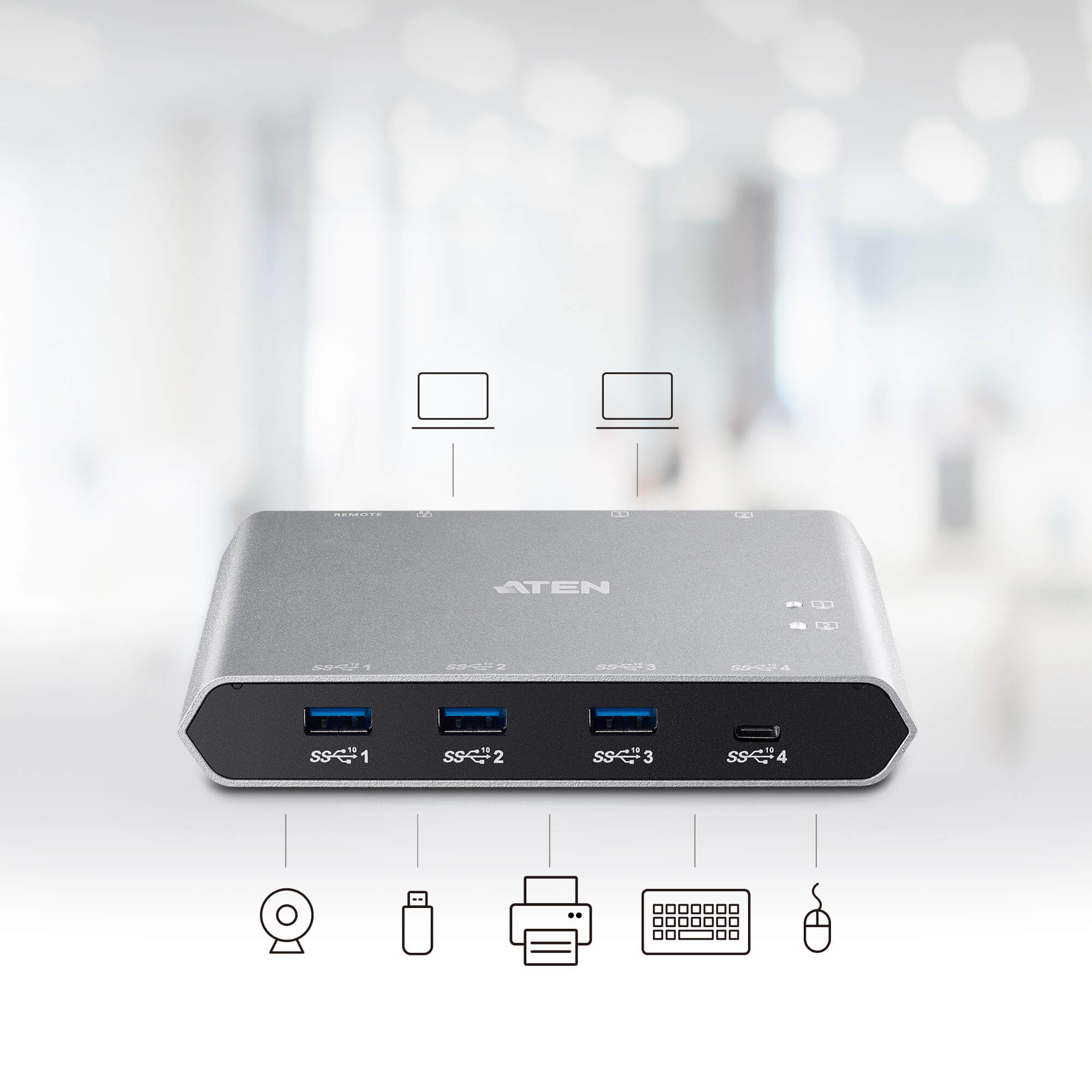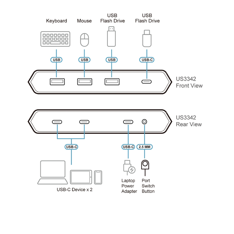 ATEN US3342 是一款2 埠USB 3.2 Gen 2 週邊分享設備,可讓使用者共享2 台USB-C 電腦之間共4 項USB 週邊設備的資料。US3342 使用USB 3.2 Gen 2 標準規格,可支援高達10Gbps 的數據傳輸速率,並向下相容USB 3.2 Gen 1、USB 2.0 及USB 1.1 等規格。 使用US3342,您可輕鬆快速地使用外接式切換按鍵切換電腦,搭載的LED 指示燈可明確指示目前連接的電腦。此產品可另接市售USB-C PD 電源變壓器,為Windows 或Mac 筆記型電腦進行充電,支援充電規格為5V、9V、15V 和20V。
