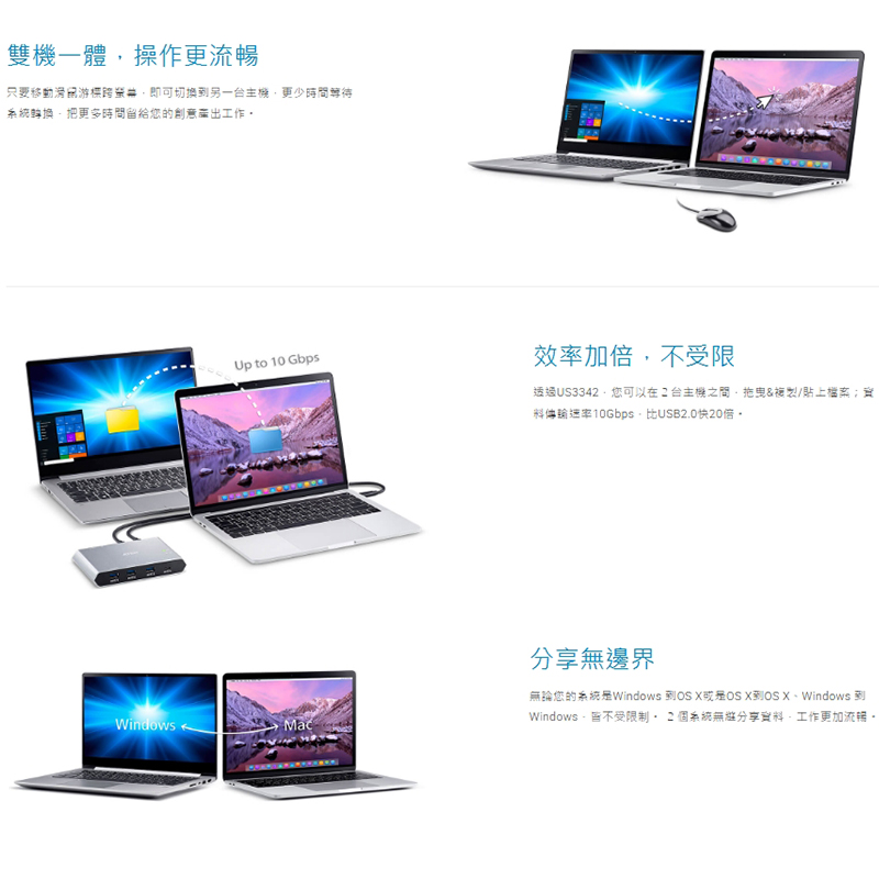 共享2 台USB-C 電腦之間共4 項USB 週邊設備的資料,傳輸速率最高可達10Gbps