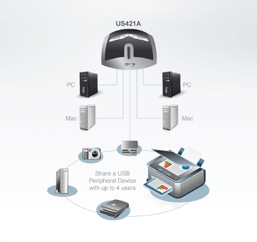 US421A能與Windows及Mac相容,並支援多功能印表機,適用於需分享最新USB 2.0周邊裝置的多媒體工作環境。