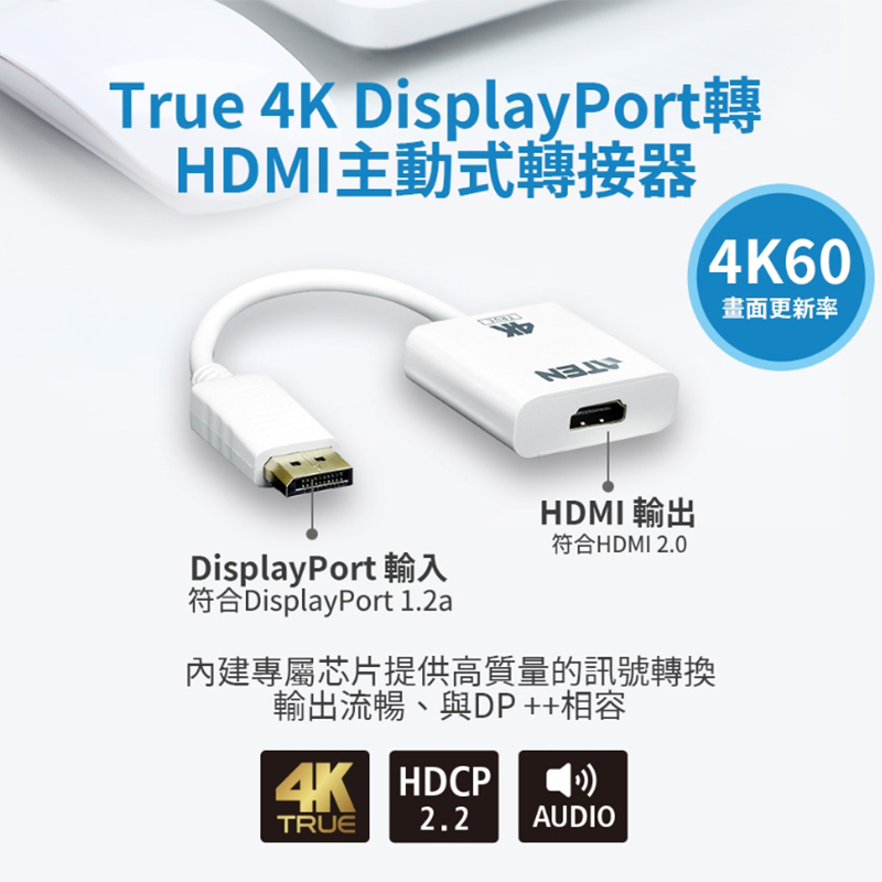 穩定的訊號轉換 – 主動式轉接器內建專屬晶片,即便輸出設備不支援Dual-Mode DisplayPort (DP++),仍可確保出畫