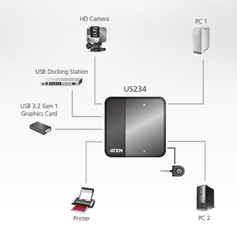 ATEN US234為2埠USB 3.2 Gen1周邊分享裝置,可供2/4台電腦分享4個USB裝置。US234支援USB 3.2 Gen1並可向下相容於USB 2.0及USB 1.1,且傳輸速率最高可達5Gbps。此款產品適用於需要高速傳輸的裝置,例如USB擴充基座或是高畫質攝影機等。