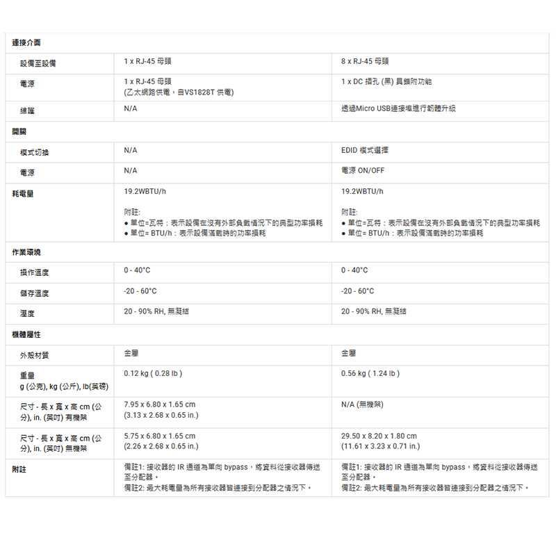 VS1828KIT包含1個分配器和8個接收器,透過一條Cat 6線即可將高達4K @ 30 Hz (4:4:4) HDMI訊號傳送至最遠40公尺處的8個顯示器。此組合支援無失真數位音訊格式,如LPCM 7.1CH、Dolby TrueHD、Dolby Digital Plus和DTS-HD Master Audio。乙太網路供電(PoC)功能讓分配器可供電給接收器,使用者只需要一個電源變壓器,即可避免雜亂的線路安裝。分配器搭載一個HDMI本地輸出連接埠,可用於內容監控或串級連接。此外,分配器具備可調式EDID開關,使用者能自行配置輸出視訊解析度和音訊功能,達到整個影音系統的無縫整合。接收器輕巧、僅掌心大的外型讓安裝更靈活,適用於狹小空間。