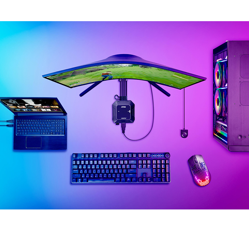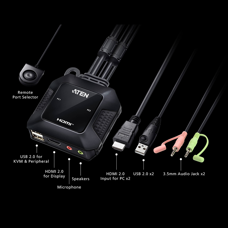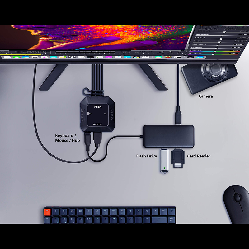 ATEN CS22H帶線式KVM多電腦切換器可透過一組USB和HDMI控制端快速存取兩台電腦,同時提供高畫質視訊解析度達4K DCI(4096 x 2160 @ 60Hz),給予使用者最大的便利性和極佳的視覺效果。