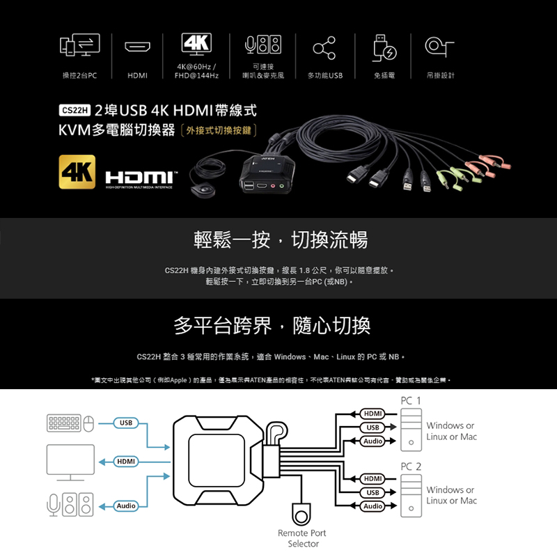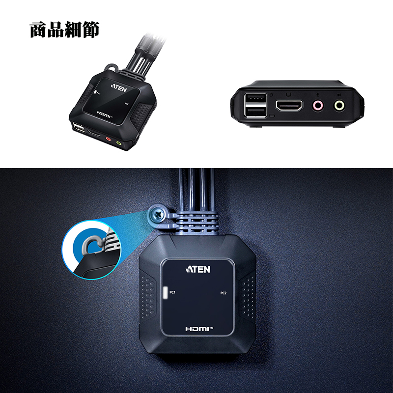 ATEN CS22H 2埠USB 4K HDMI帶線式KVM多電腦切換器 USB供電設計