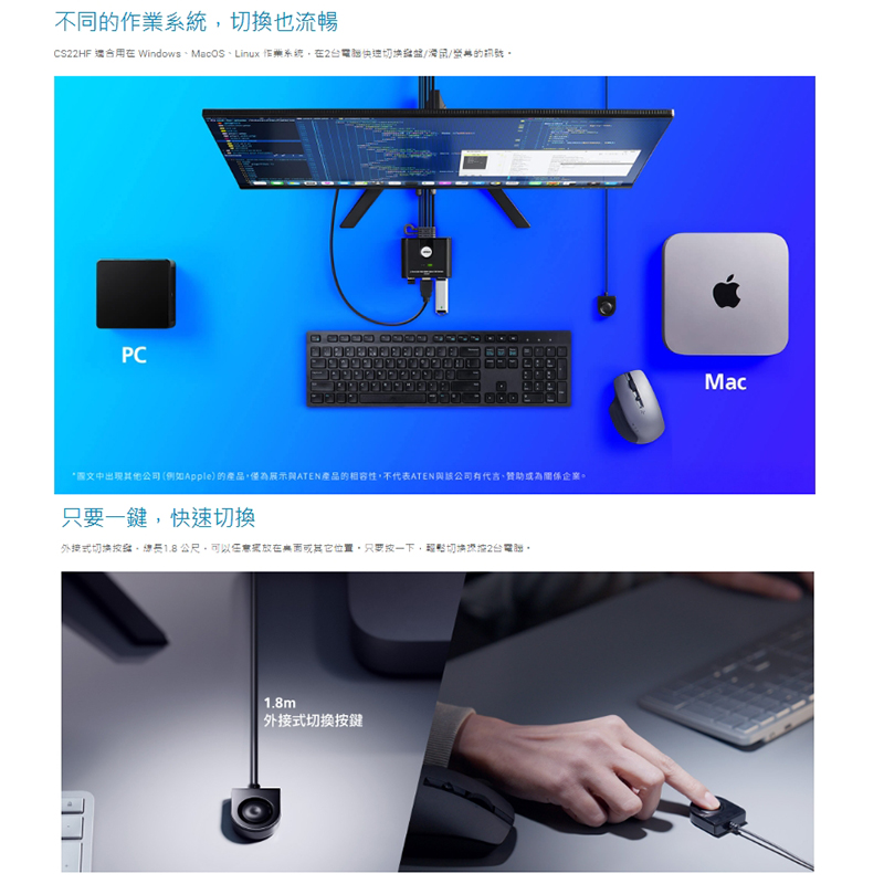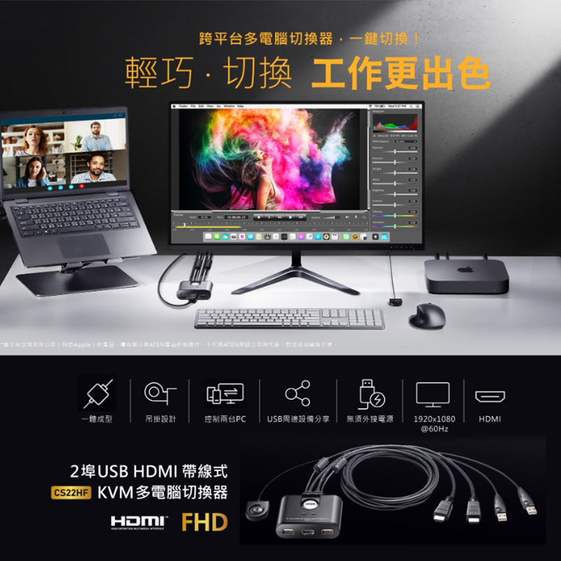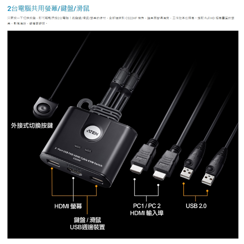 CS22HF是一款2埠USB FHD HDMI帶線式KVM多電腦切換器,使用者可透過一組USB 和HDMI介面的控制端快速存取兩台電腦,同時提供高達1920 x 1080 @ 60 Hz /1920 x 1200 @ 60 Hz 高畫質視訊解析度。透過外接式切換按鍵,CS22HF可簡單快速地切換兩台USB HDMI介面的電腦;其跨平台切換操作功能,便利使用者在兩台不同作業系統的電腦間切換操作。