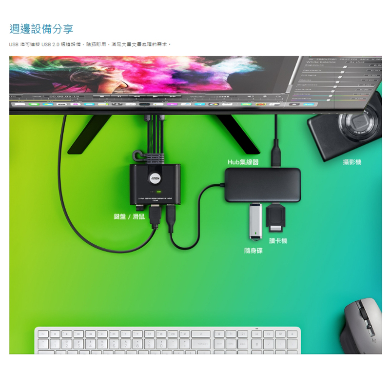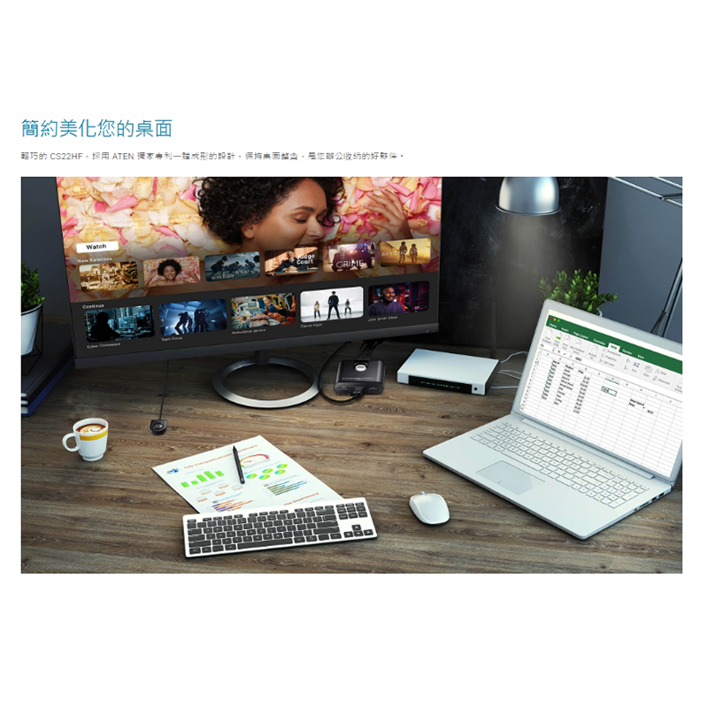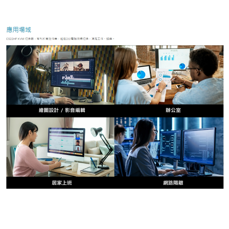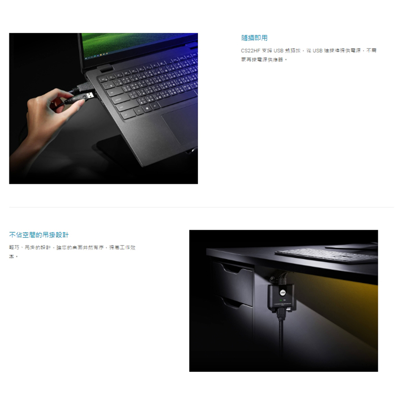 此外,CS22HF輕巧精緻的外觀設計,讓使用者可有效率地安裝設備及整理佈線,為使用者提供且節省空間的理想解決方案,讓辦公桌的桌上空間布置變得井然有序。此款隨插即用的多電腦切換器適用於任何工作環境,特別適用於需要在兩台電腦間快速處理多項任務的使用者。