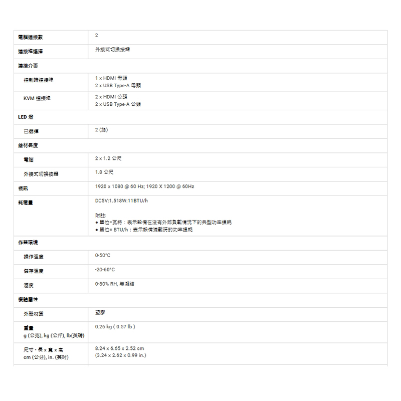 高畫質視訊解析度 – 最高可支援1920 x 1080 @ 60 Hz / 1920 x 1200 @ 60Hz