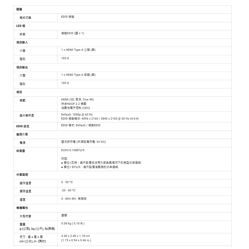 透過EDID複製模式可支援高畫質視訊解析度達4096 x 2160 / 3840 x 2160 @ 60 Hz (4:4:4)