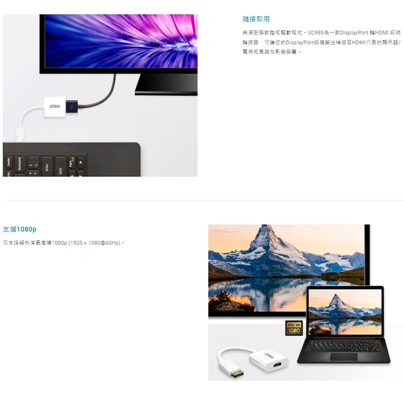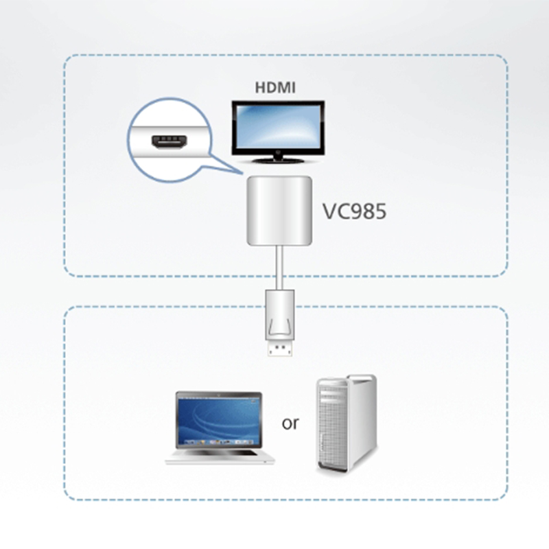 VC985是一款具經濟效益、高性能的訊號轉換解決方案。這些轉接器支援具備DisplayPort輸出的桌上型電腦或是筆記型電腦,