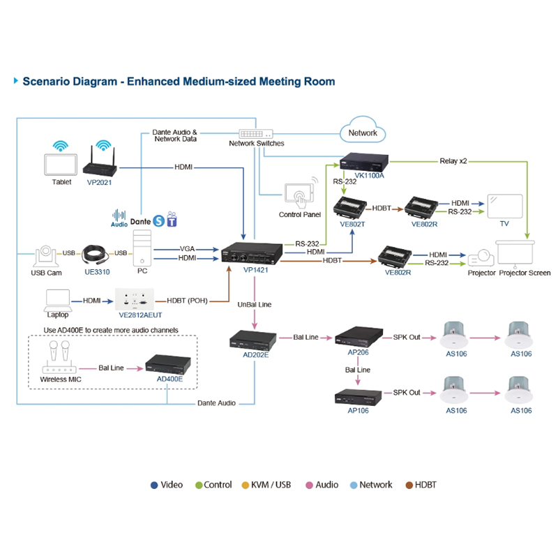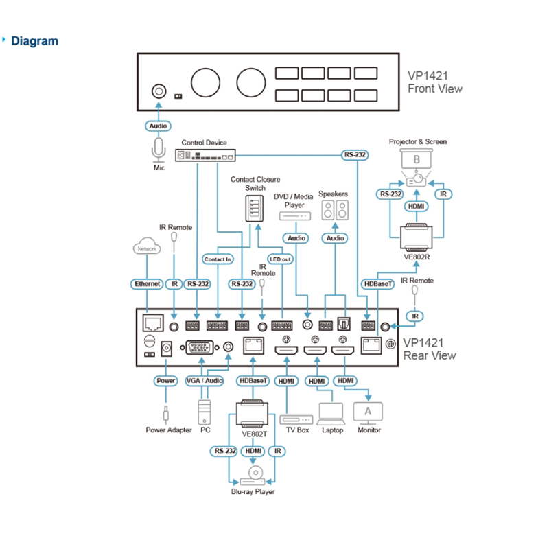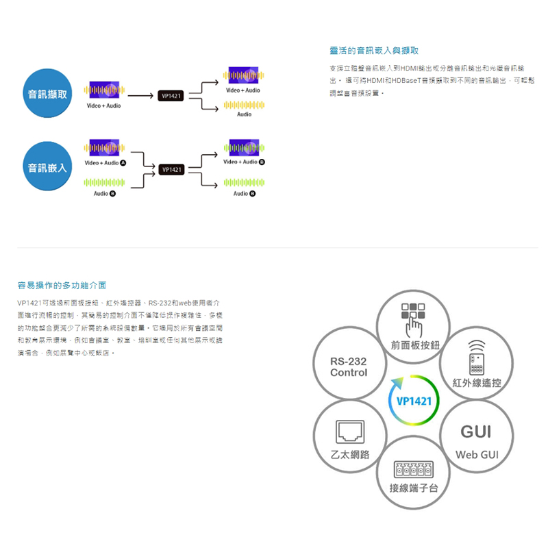 VP1421可透過前面板按鈕、紅外遙控器、RS-232 和web使用者介面進行流暢的控制,其簡易的控制介面不僅降低操作複雜性,多樣的功能整合更減少了所需的系統設備數量。它適用於所有會議空間和教育展示環境,例如會議室、教室、培訓室或任何其他展示或講演場合,例如展覽中心或飯店。