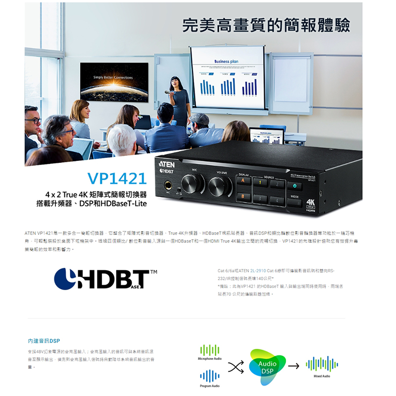ATEN VP1421是一款多合一簡報切換器,它整合了矩陣式影音切換器、True 4K 升頻器*、HDBaseT視訊延長器、音訊DSP和類比轉數位影音轉換器等功能於一精巧機身,可輕鬆裝設於桌面下或機架中。透過四個類比/數位影音輸入源與一個HDBaseT和一個HDMI True 4K輸出之間的流暢切換,VP1421 的先進設計協助您有效提升專業簡報的效率和影響力。