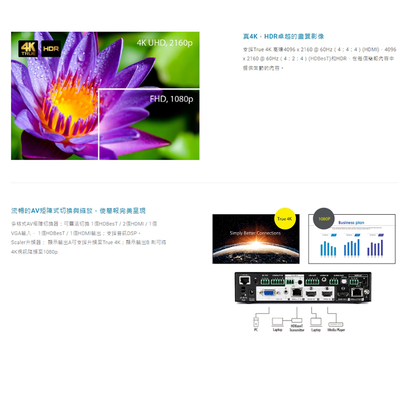 卓越的影像畫質 – 支援True 4K解析度高達4096 x 2160@60Hz (4:4:4) (HDMI) / 4096 x 2160@60Hz (4:2:0) (HDBaseT)