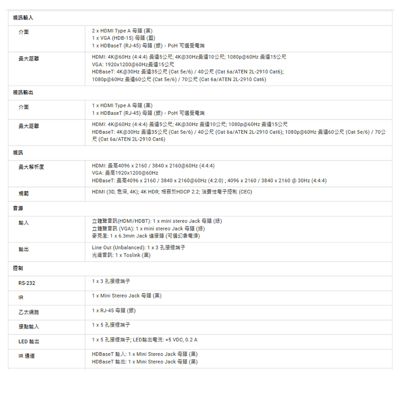 *備註:此為VP1421 的HDBaseT 輸入與輸出端同時使用時,兩端各延長70 公尺的傳輸距離加總。