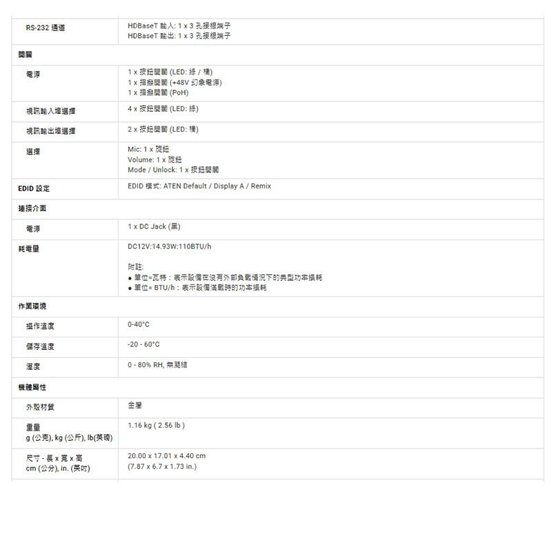 Power over HDBaseT (POH) – 透過現有通訊線即可進行遠端供電;內建指撥開關可選擇受電設備