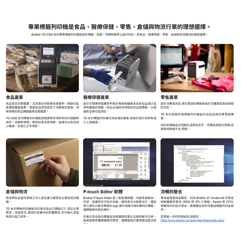 | 支援的指令 | Raster, ESC/P, P-touch Template, ZPL II emulation, CPCL emulation (CPCL page print mode / CPCL line print mode), EPL2 emulation, DPL emulation |