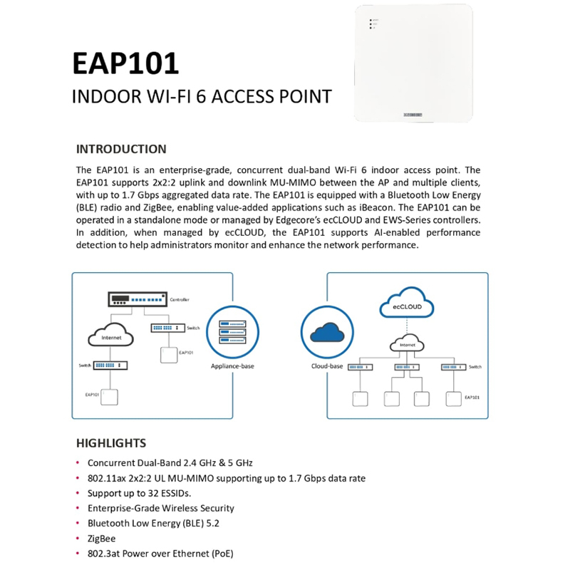 EAP101 可採用 獨立模式 (Standalone mode) 運行,或透過 Edgecore ecCLOUD 雲端控制器進行集中管理。