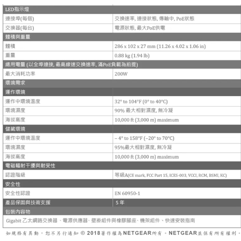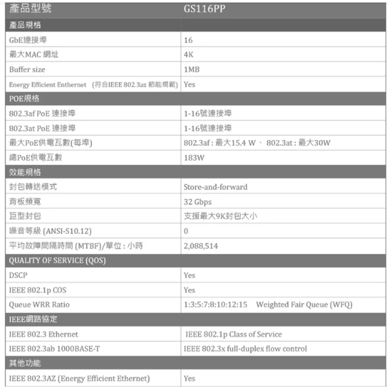 NETGEAR GS116PP 16 埠 Gigabit PoE PoE 無網管交換器 數量