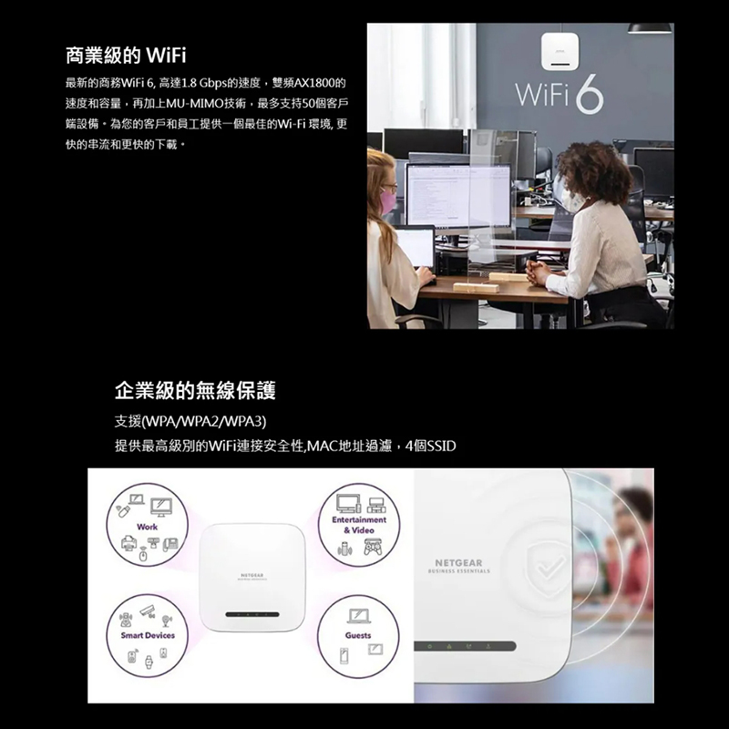 - 高性能商用802.11ax Wave 2雙頻WiFi,吞吐量1.8Gbps