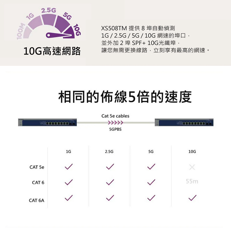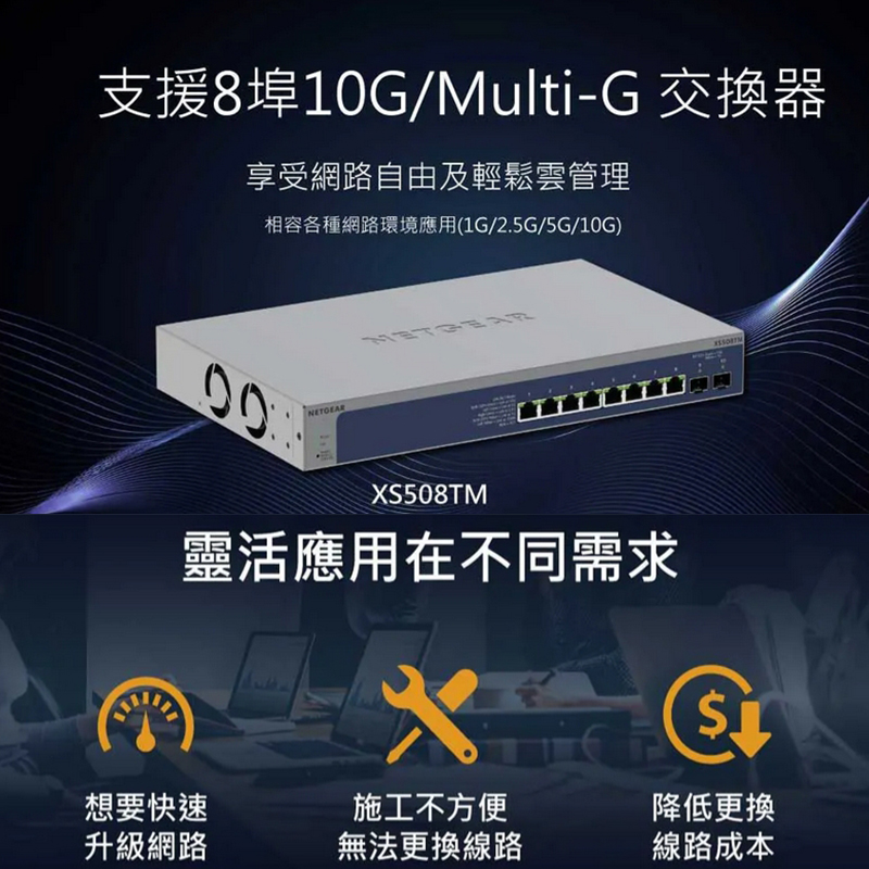NETGEAR XS508TM 1G/2.5G/5G/10G Gigabit +2 埠 8埠 10G光纖 雲管理智能型五速交換器