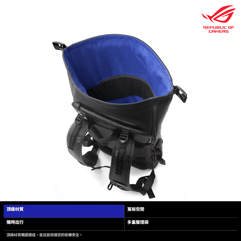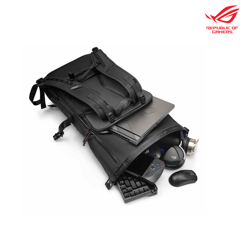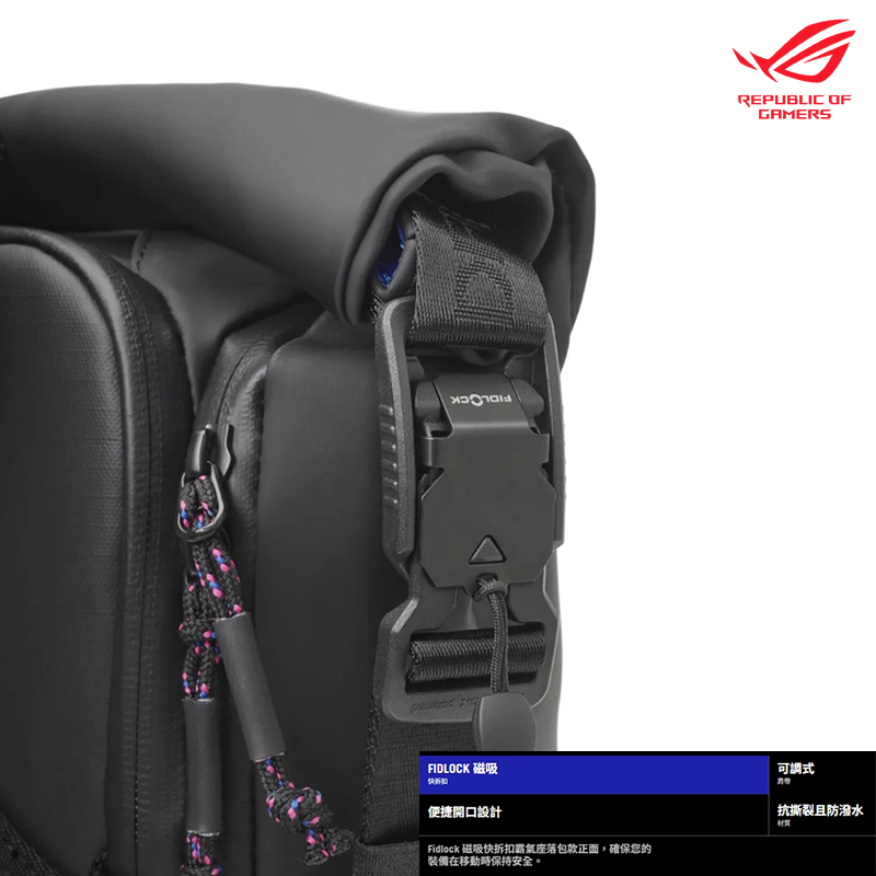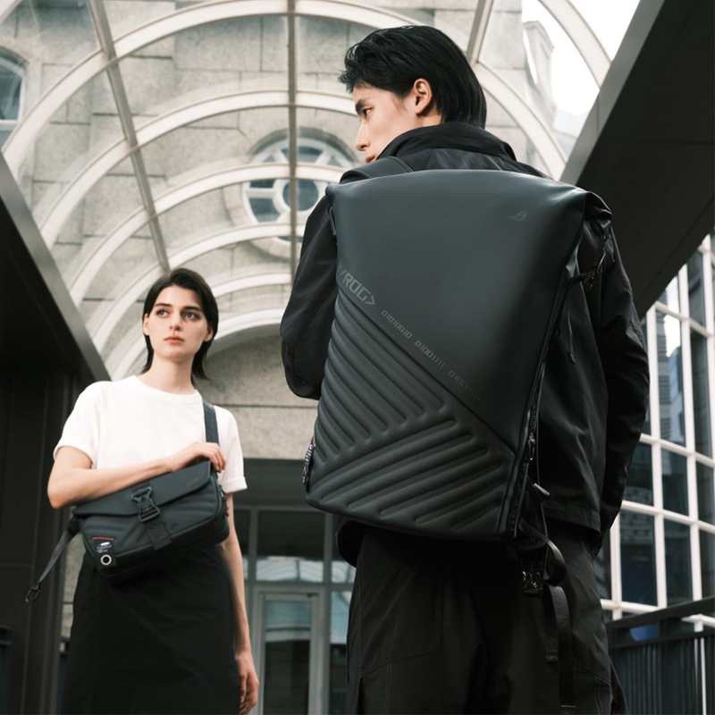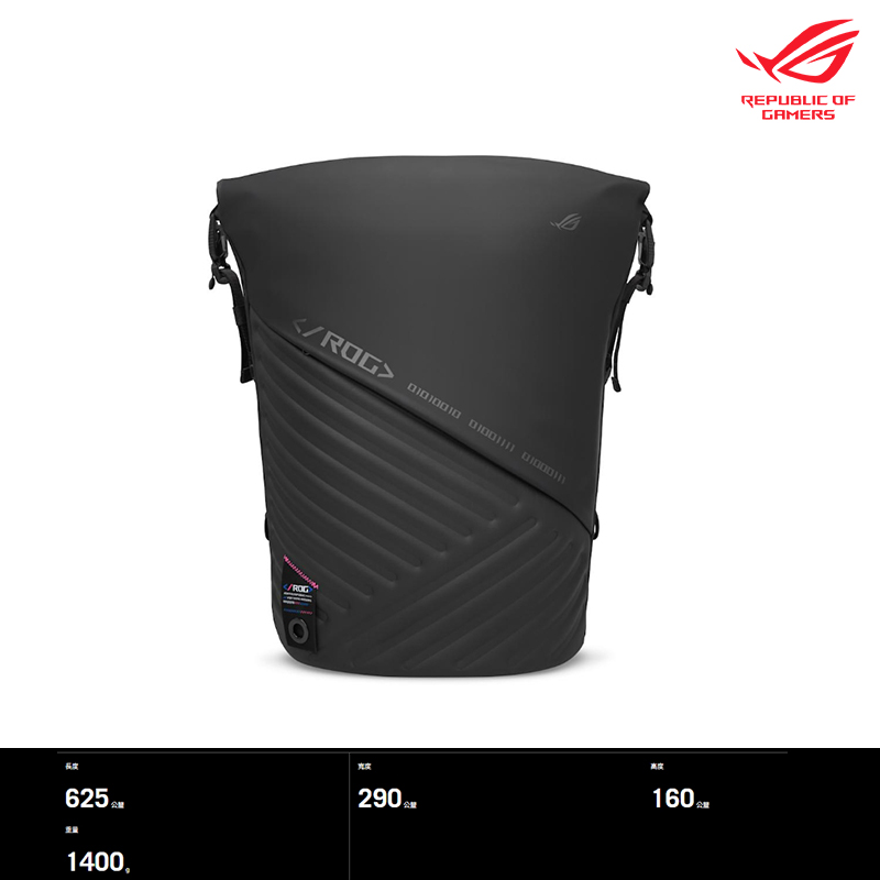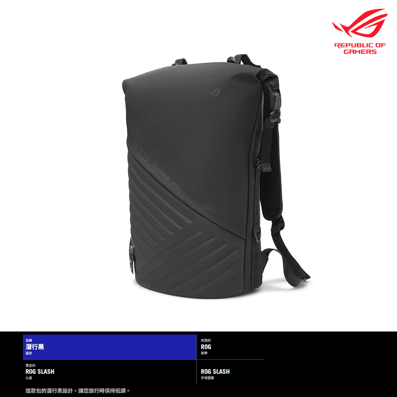 - 極具辨識度的 ROG SLASH 外觀設計,這款背包不僅擁有高科技、未來感的風格,還具備適合筆電攜帶的時尚配色。