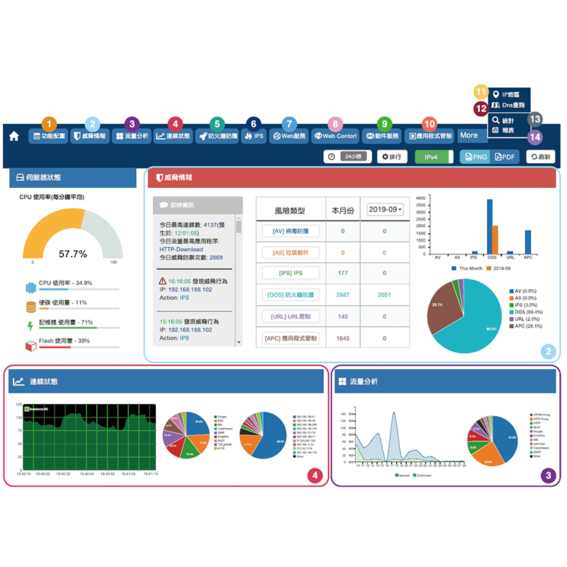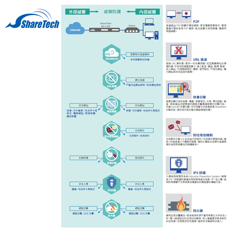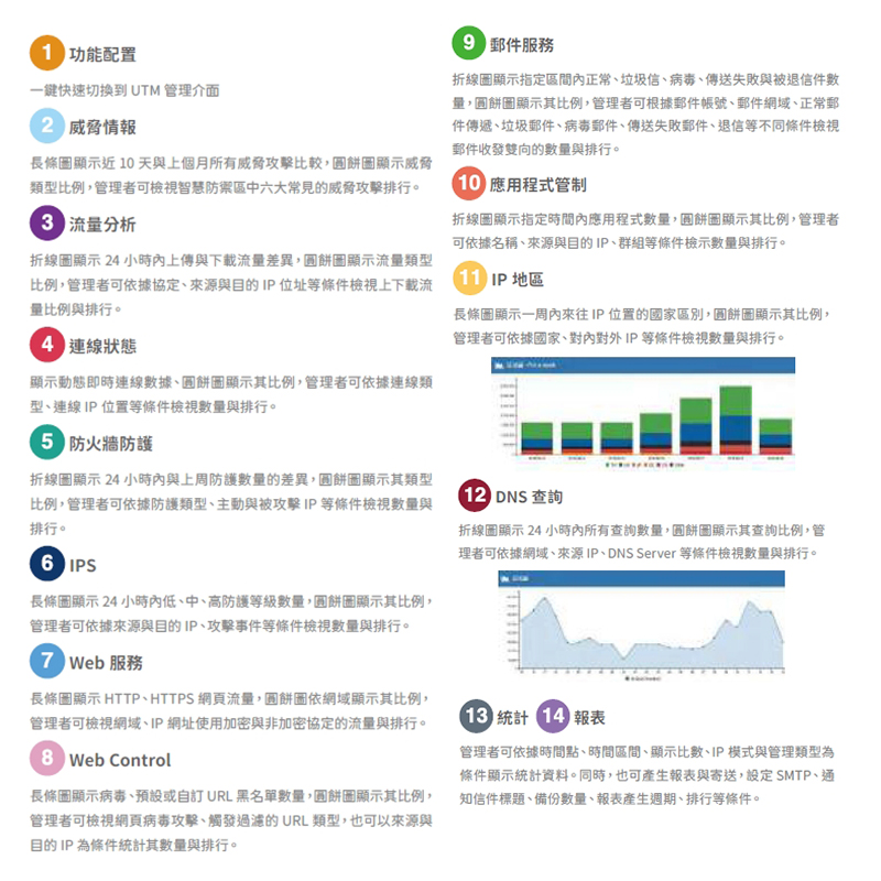 新世代防火牆功能、防毒(Clam AV)、垃圾郵件過濾、IPS入侵偵測、