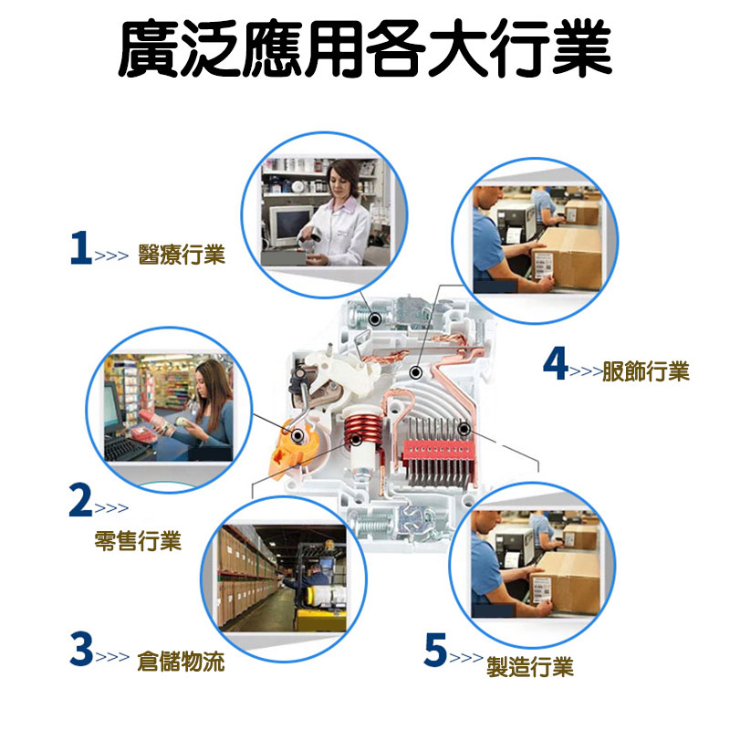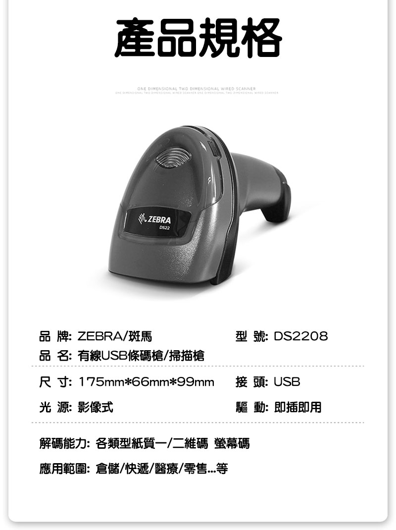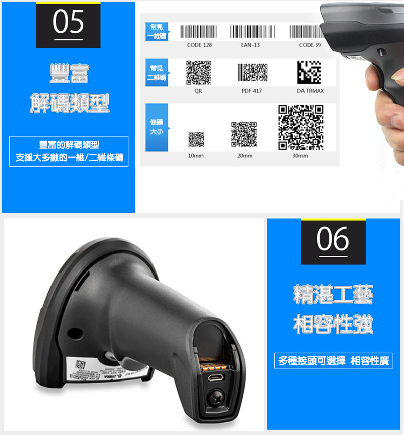 掃描各式條碼: 可掃描0.5寸/1.23mm-14.5寸/36.8mm各種條碼。
